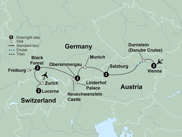 Discover storybook castles and opulent palaces amidst stunning Alpine vistas as you explore Austria, Germany, and Switzerland. Visit Schönbrunn Palace in Vienna. Take a cruise along the legendary Danube. Stroll the quaint streets of Salzburg, the "City of Music." Spend two nights in the heart of the Black Forest. Visit Oberammergau, renowned for its 380-year tradition of producing a Passion Play every decade. Witness the beauty of Linderhof Palace and its perfect decorated gardens. From Vienna and the Black Forest to the Swiss Alps and Lucerne, explore the heart of Europe.